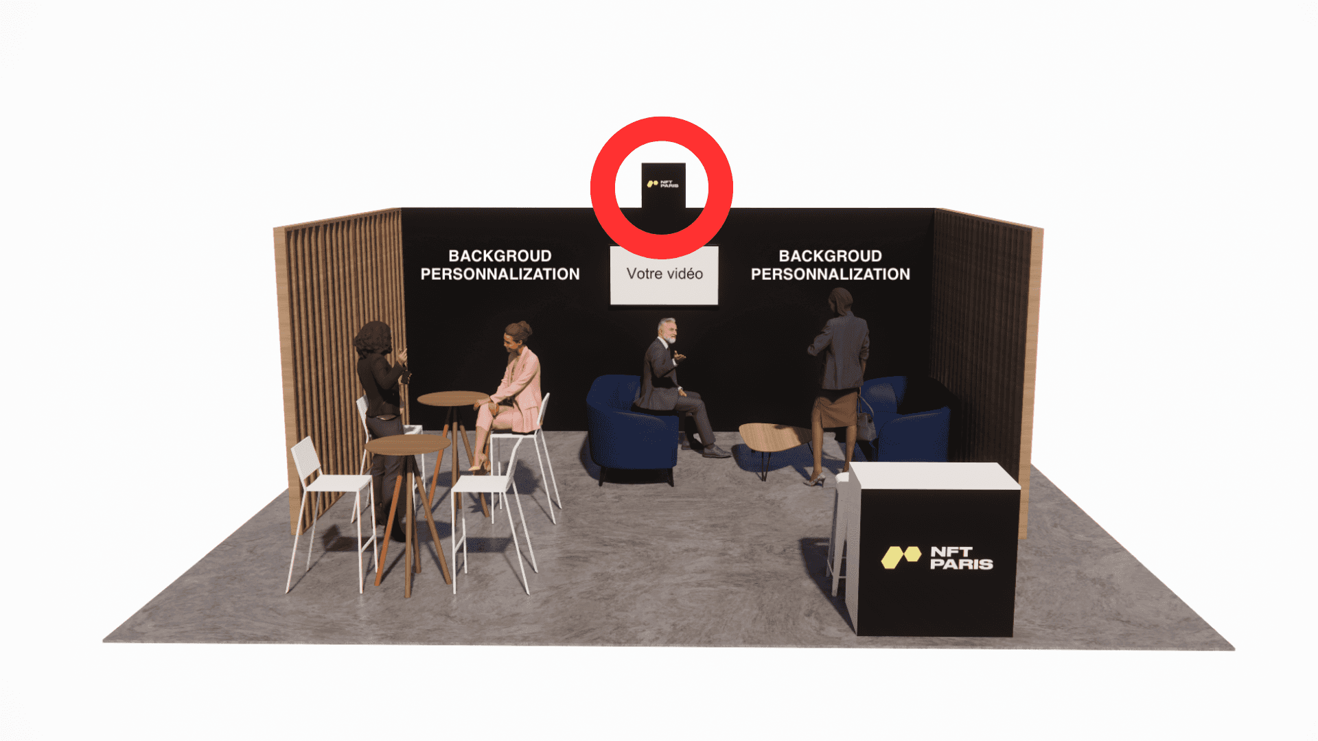 A logo will appear on your desk + the central part of the background of your booth will be personalized by default from a 3Mx3M size